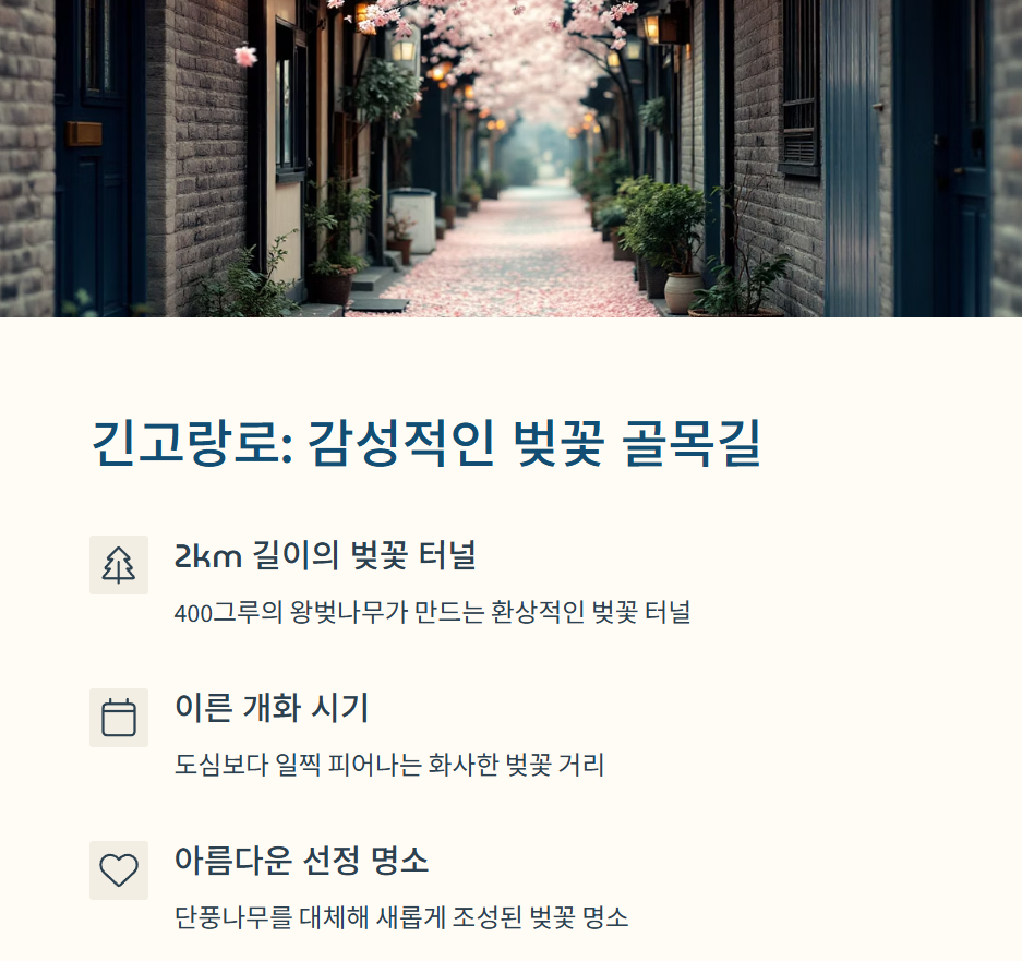 ✅ 추천 팁: 오전 8시 이전에 도착하면, 햇살과 꽃잎이 어우러진 한적한 골목길을 여유롭게 즐길 수 있어요!