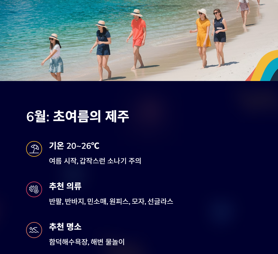 물놀이가 가능해지는 시기인 6월은 제주도의 바다를 즐기기에 최적의 달이며, 대부분 반소매와 반바지로 충분합니다. 해변 방문 시 자외선 차단 아이템도 잊지 말아야 합니다.