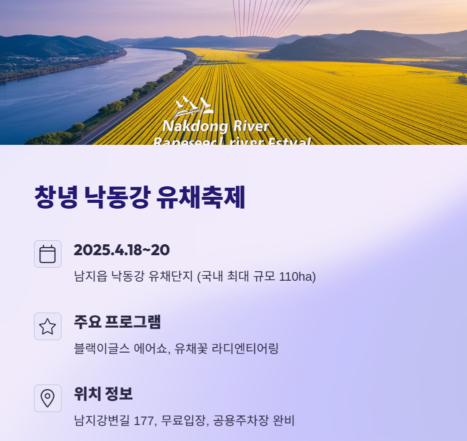 | 창녕낙동강유채축제 | 2025년 4월 18일 ~ 20일 |