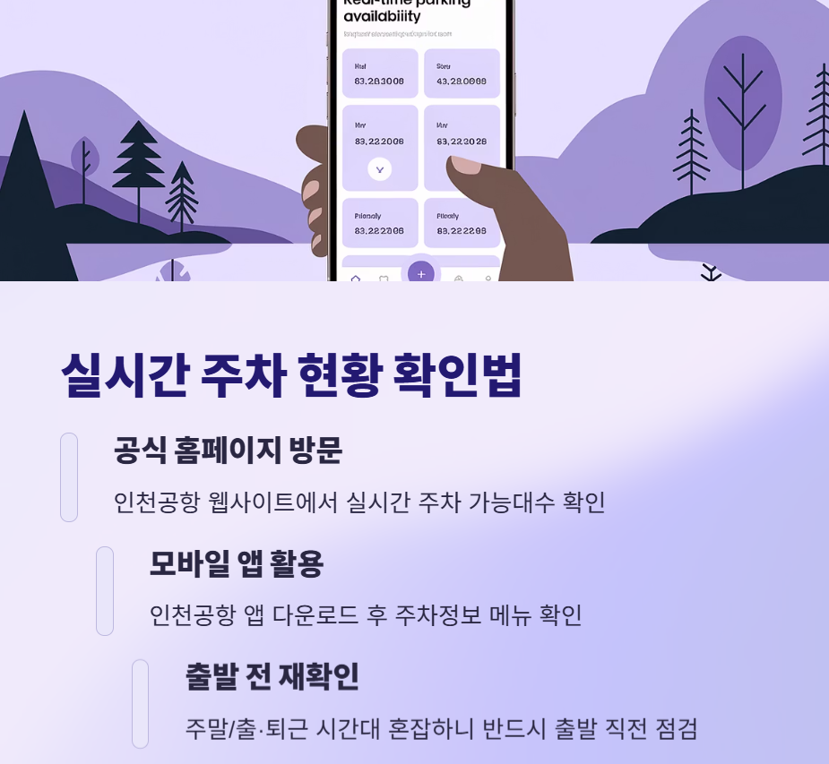 | 성수기에는 단기주차장이 빠르게 만차되는 경향이 있습니다. 출발 전에 실시간 주차 현황을 인천공항 홈페이지나 모바일 앱에서 꼭 확인해 주세요. 공항 도착 최소 2시간 전 여유를 두고 출발해야 주차 공간 확보가 용이합니다. P5 예약주차장을 고려하거나, 만차 시에는 근처 무료 공영주차장을 대안으로 활용하세요. 주차대행 서비스는 바쁜 일정이나 만차 상황에서도 차량을 맡기기 좋습니다. |