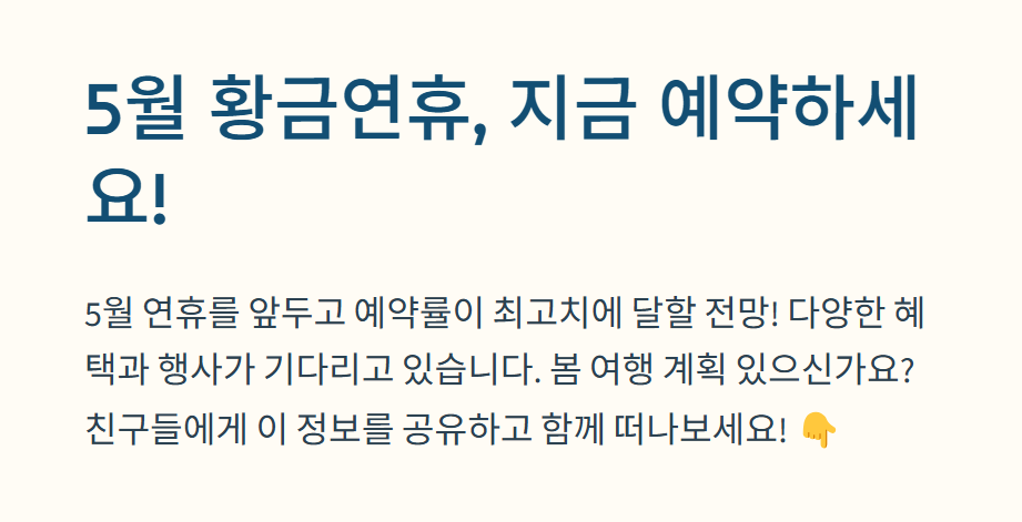 | 5월 황금연휴 국내 여행 수요 폭증, 예약률 높은 도시 TOP 지역은? 🏞️ (1) | 2025.04.21 |