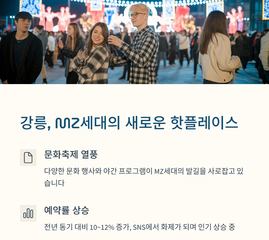 | 강릉 | MZ세대 및 문화 체험형 여행객 | 자연 경관/축제 | 약 10~12% |