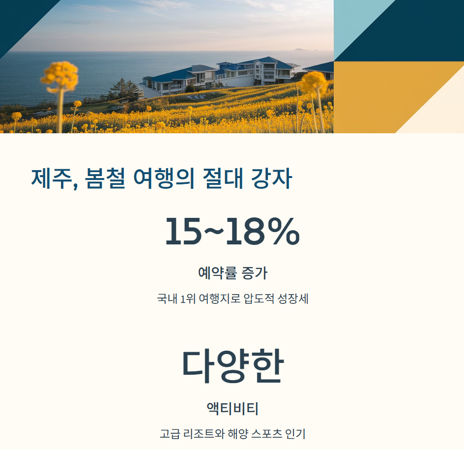 | 제주는 4월과 5월 봄 시즌에 특히 높은 예약률 증가를 보입니다. 항공 노선 확장과 이용 편의성은 주요 요인 중 하나입니다. 리조트와 숙박 옵션은 가족 단위 여행객 유치에 강점을 보입니다. 유채꽃밭, 한라산, 자연관광 등 계절적 특색을 즐길 수 있는 관광지가 밀집해 있습니다. 특히 봄에만 경험할 수 있는 자연 풍경이 관광객 증가의 핵심입니다. |
