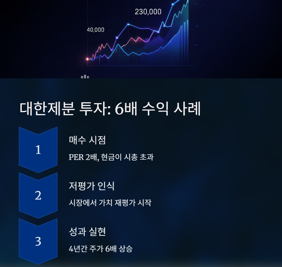 | 대한제분 | 2004년 | 배당률 35%, 현금가치 초과 | 6배 상승 |