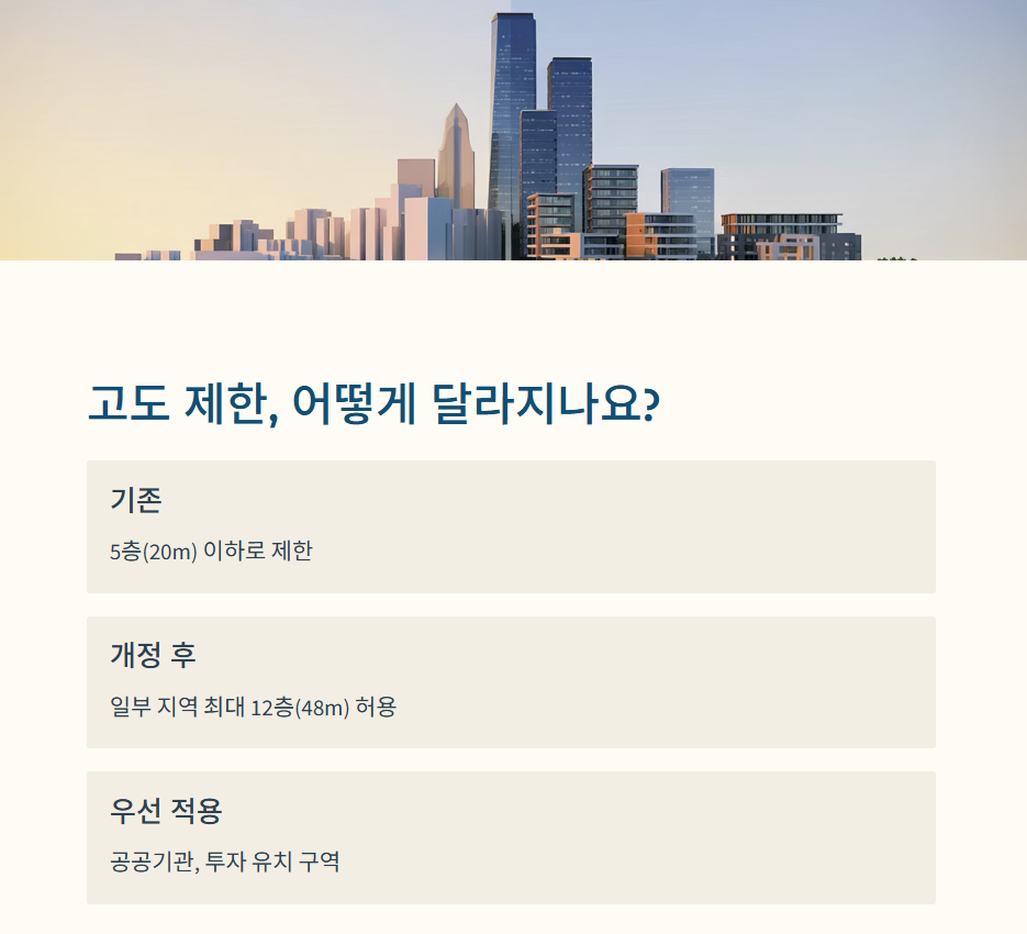 - 기존 15m 내외 제한 ➔ 상업지역은 30~50m까지 허용