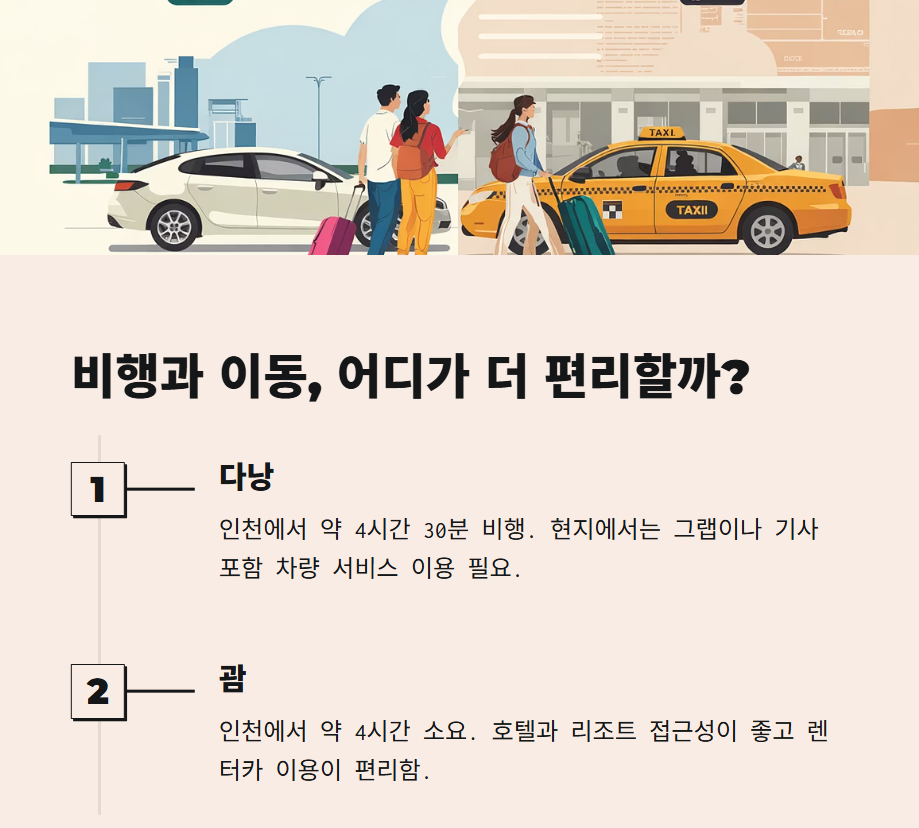 총평: 짧은 이동시간과 공항 접근성에서는 괌이 다소 유리합니다.