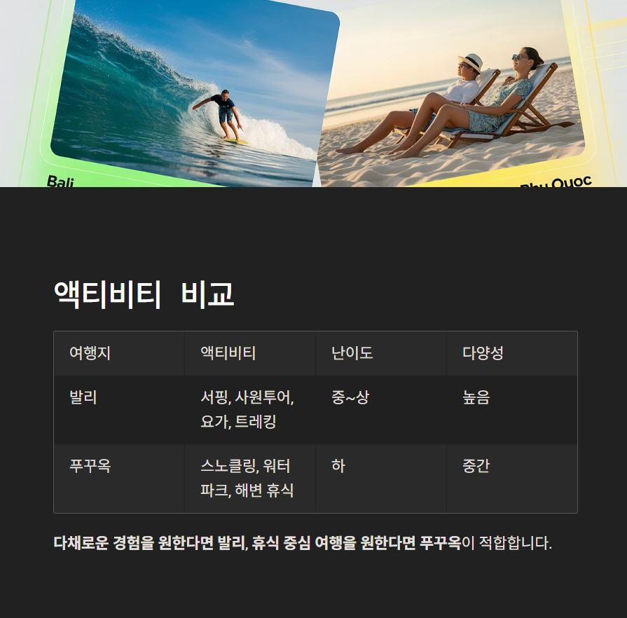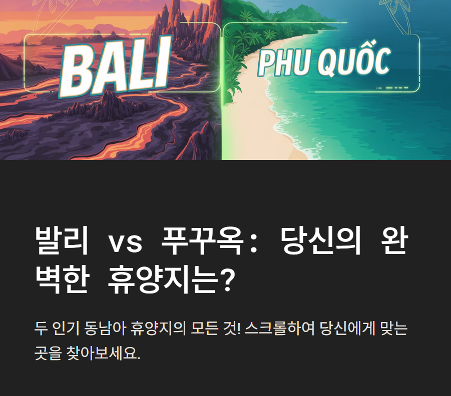 여행 목적과 스타일에 따라 "발리의 다채로움"과 "푸꾸옥의 여유로움" 중 선택해 보시길 추천드립니다.